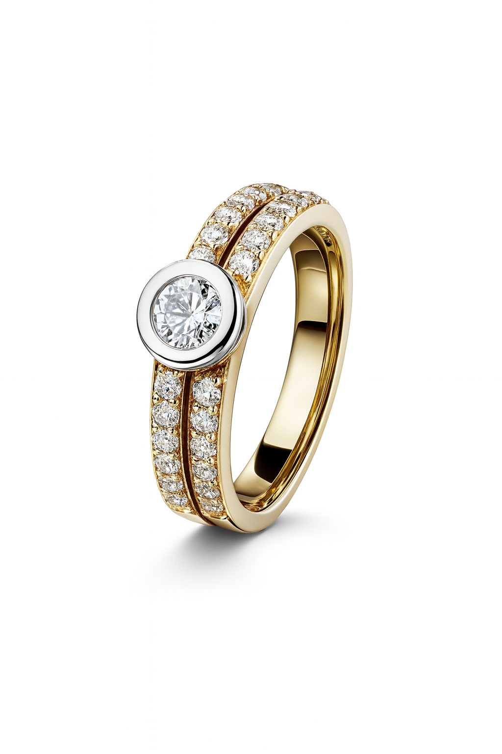 18krt geelgouden ring met briljant 44-0.53ct en een middensteen van 0.18ct HSI