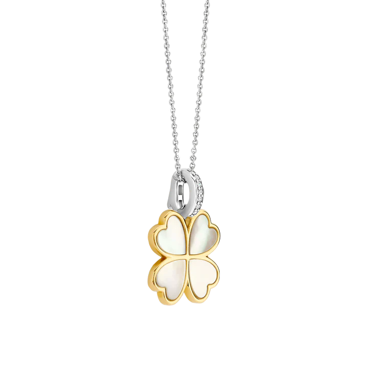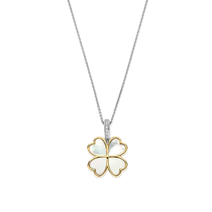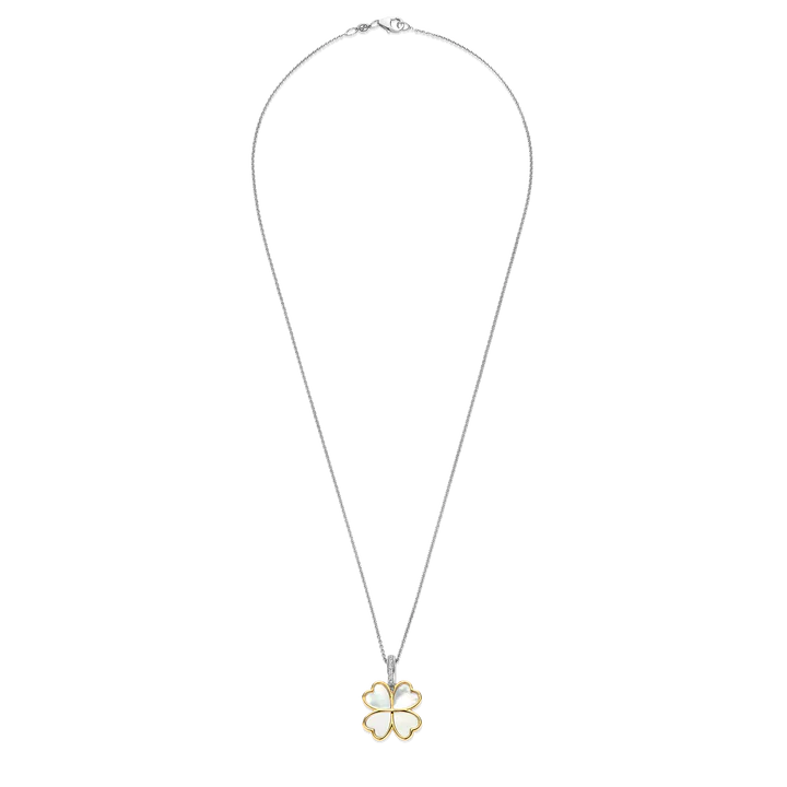 De TI SENTO klaverhanger 6821MW is een symbool van geluk, elegantie en moeiteloze charme. Gemaakt van hoogwaardig 925 sterling zilver, is dit betoverende klavertje vier omlijst met een stralende geelgouden kleur, wat de zachte glans van de parelmoeren inleg accentueert. Delicaat maar opvallend, het is een sieraad dat zowel betekenis als schoonheid in perfecte harmonie vangt. De hanger wordt geleverd met een sierlijke zilveren collier van 45 cm. Opgehangen aan een platina vergulde zilvergekleurde clipring, versierd met pavé gezette cubic zirconia, vangt deze hanger het licht met subtiele schittering. Bevestig het aan een van je favoriete kettingen om een gepersonaliseerde look te creëren die uniek is. Of het nu gedragen wordt als geluksbrenger of gelaagd voor een moderne, samengestelde uitstraling, de verfijnde details en tijdloze symboliek maken het een instant klassieker. Nikkelvrij en hypoallergeen, het belooft luxueus comfort bij elk draagmoment. Een gouden vleugje fortuin, klaar om overal met je mee te gaan.