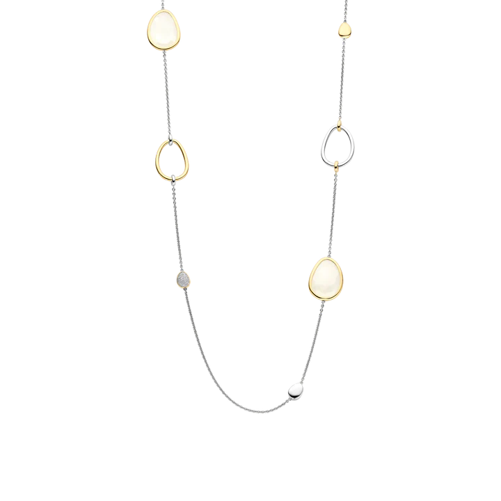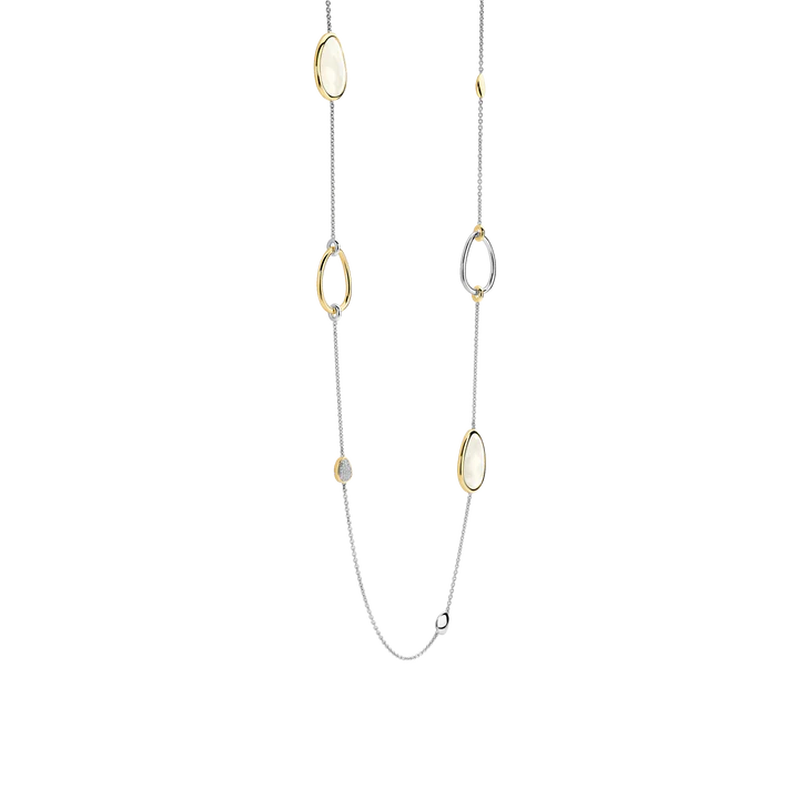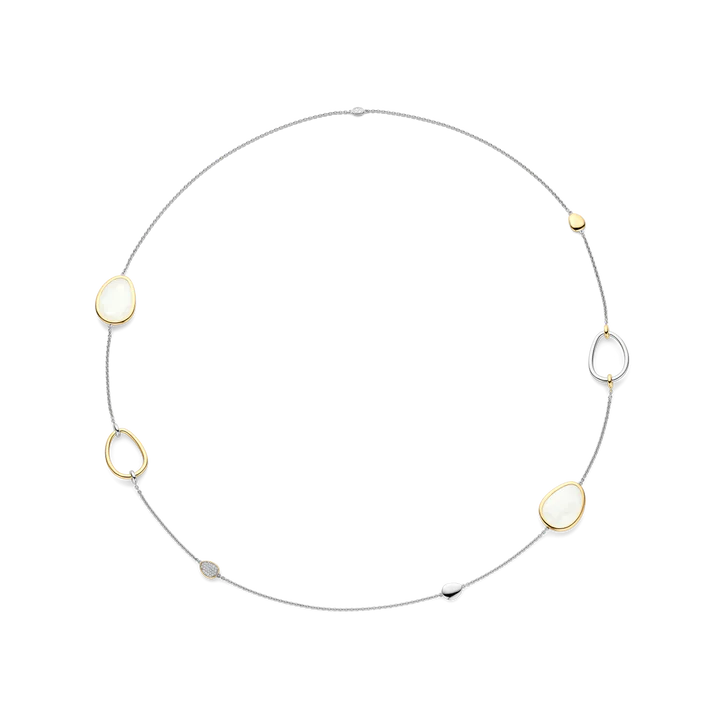 Ontdek organisch ritme met dit TI SENTO vergulde collier 34102MW/80. Vervaardigd uit 925 sterling zilver toont dit lange station collier een elegant spel van asymmetrische, kiezelvormige accenten, sommige pavé gezet met zirconia, andere omlijst door goudkleurige vergulding of afgewerkt met een spiegelgepolijste platinakleurige glans. Gefacetteerde parelmoerstenen geven een stralende, natuurlijke gloed en versterken het zachte, vrije karakter van het collier. Langs een fijn zilveren collier lijken de elementen zorgvuldig geplaatst en toch speels spontaan, een echo van de serene verspreiding van gladde kiezels langs een rivierbedding. Of het nu wordt gecombineerd met kortere colliers of alleen gedragen voor een minimalistisch effect, dit sieraad brengt moeiteloze verfijning in zowel dagelijkse als avondlooks. Een eigentijdse interpretatie van klassieke parel- en schakelcolliers, waarin subtiele beweging en elegantie samenkomen. Combineer met bijpassende oorbellen, armbanden of ringen uit de TI SENTO collectie voor een krachtig sieradenstatement. Nikkelvrij en hypoallergeen, het biedt optimaal comfort en tijdloze draagbaarheid.